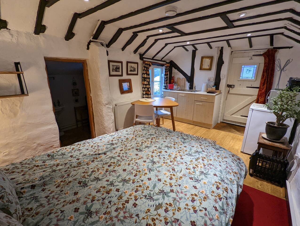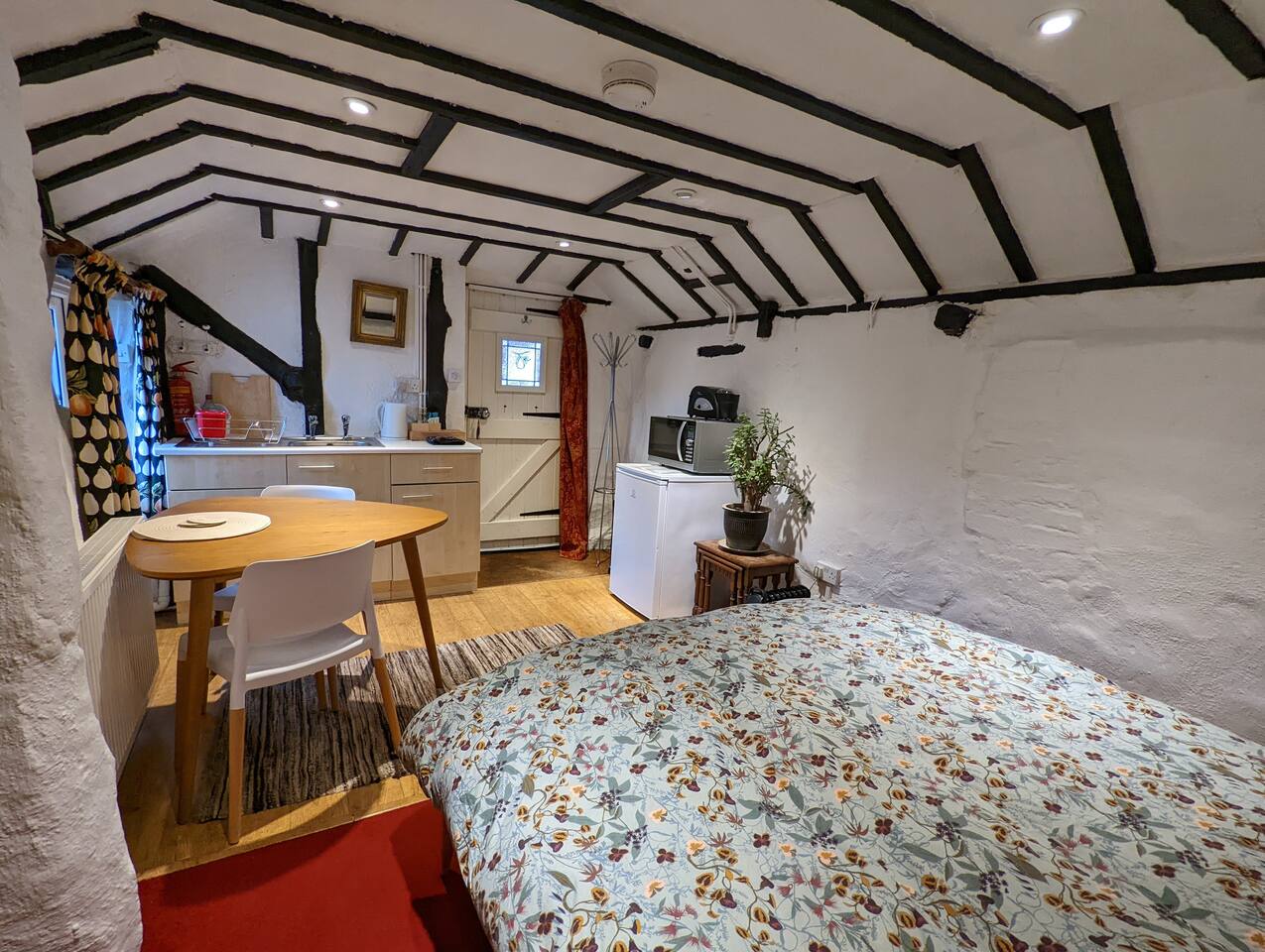 A warm and cosy timber framed studio, equipped with a comfortable double bed, a kitchenette for light self catering (microwave and mini-oven but no hob), and private shower room. Our wood-fired hot tub is available to book for just £30 an hour for private sessions with full cleans in between.